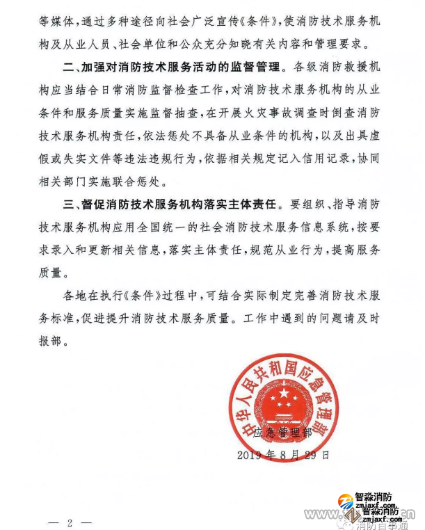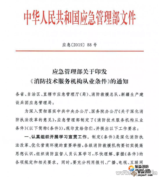 為深入貫徹落實(shí)中共中央辦公廳、國務(wù)院辦公廳《關(guān)于深化消防執(zhí)法改革的意見》,應(yīng)急管理部制定了《消防技術(shù)服務(wù)機(jī)構(gòu)從業(yè)條件》(以下簡稱《條件》),現(xiàn)印發(fā)給你們,并提出以下工作要求: