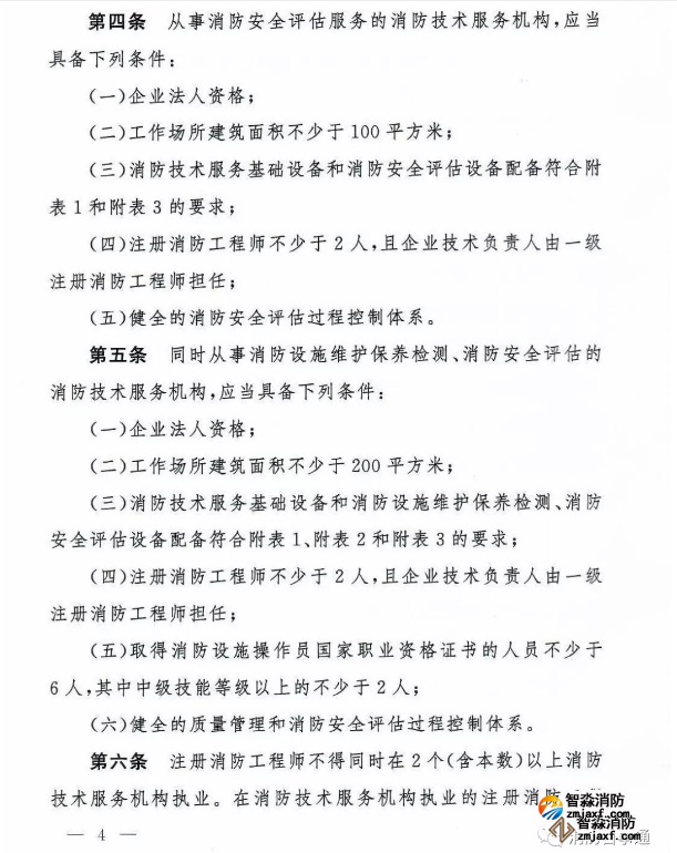 第五條 同時(shí)從事消防設(shè)施維護(hù)保養(yǎng)檢測、消防安全評(píng)估的消防技術(shù)服務(wù)機(jī)構(gòu),應(yīng)當(dāng)具備下列條件: