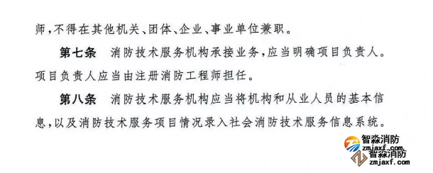 第七條 消防技術(shù)服務(wù)機(jī)構(gòu)承接業(yè)務(wù),應(yīng)當(dāng)明確項(xiàng)目負(fù)責(zé)人。項(xiàng)目負(fù)責(zé)人應(yīng)當(dāng)由注冊(cè)消防工程師擔(dān)任。