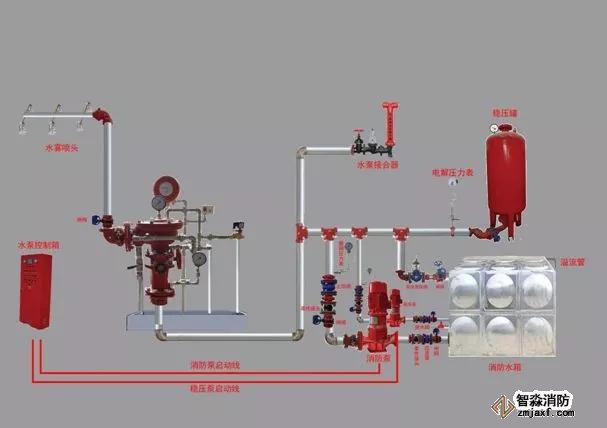 3、系統綜合性功能試驗:根據原設計的不同要求,對消防水泵分別進行自動、手動、遠程和泵房內就地啟動的試驗;消防水泵組的主泵與副泵互為備用功能的相互切換試驗;根據有關要求進行水壓試驗和氣壓試驗;對報警控制裝置功能進行檢驗(如:濕式、干式系統的噴頭動作后,是否由報警閥組的壓力開關直接連鎖控制并自動啟動供水泵。消防控制室(盤)能否控制水泵、電磁閥、電動閥等的操作,并能顯示水流指示器、壓力開關、信號閥、水泵、消防水池及水箱水位、有壓氣體管道和電源等是否處于狀態的反饋信號);報警閥功能試驗(打開報警閥,查看測量報警動作狀態,輸出信號情況和消防水泵啟動、聯動、控制盤顯示情況是否符合檢驗要求;打開放水試驗閥,測量水的流量和壓力應符合檢驗要求);系統聯動試驗(模擬火災信號,火災自動報警系統應發出聲光報警信號并啟動自動噴水滅火系統;啟動末端試水裝置處放水)。
