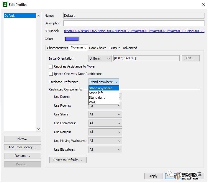 舊版的Pathfinder模擬扶梯時(escalators)人員在扶梯上的狀態只能是行走(Walk),而新版本的Pathfinder增加扶梯上人員的狀態選項,人員可以在扶梯上站立(Stand)也可以行走(Walk),并且可以選擇人員在扶梯上站立的位置,包括靠左站立、靠右站立和站立在任意位置,該功能的增加無疑使疏散模擬情景更接近實際。